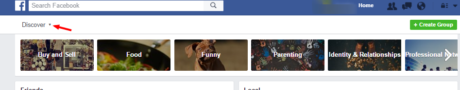 Head over to Facebook right now and click on “groups”. If you’re logged into Facebook, then you’ll click on “groups” in your left-hand side bar. You can then click on it again in your header and you’ll see a dropdown menu. Click “discover”.