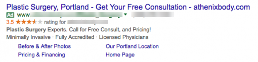 It's another reason why online reputation management is increasingly important. For example, when I did a search for ‘best plastic surgeon in Oregon,' here's the ad that showed up at the top of the page.