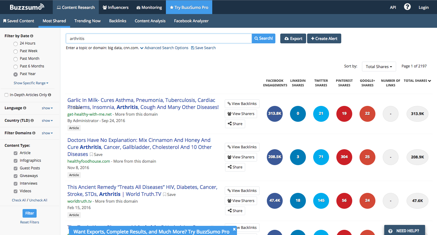 One of the fastest and easiest ways to do this is using a site like BuzzSumo. In this example, I've typed in the word “arthritis” and found the top articles shared online over the past 12 months.