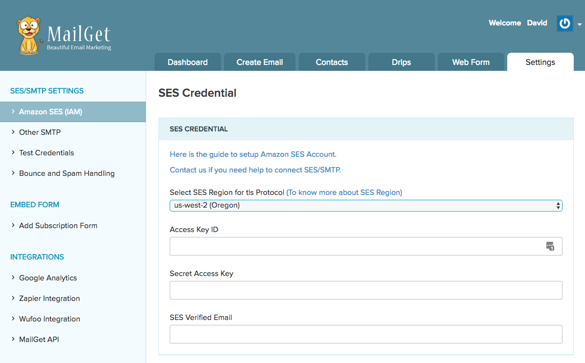 Once SES configuration is complete, you'll need to connect them to your MailGet account using the access key and secret id that Amazon provides you.