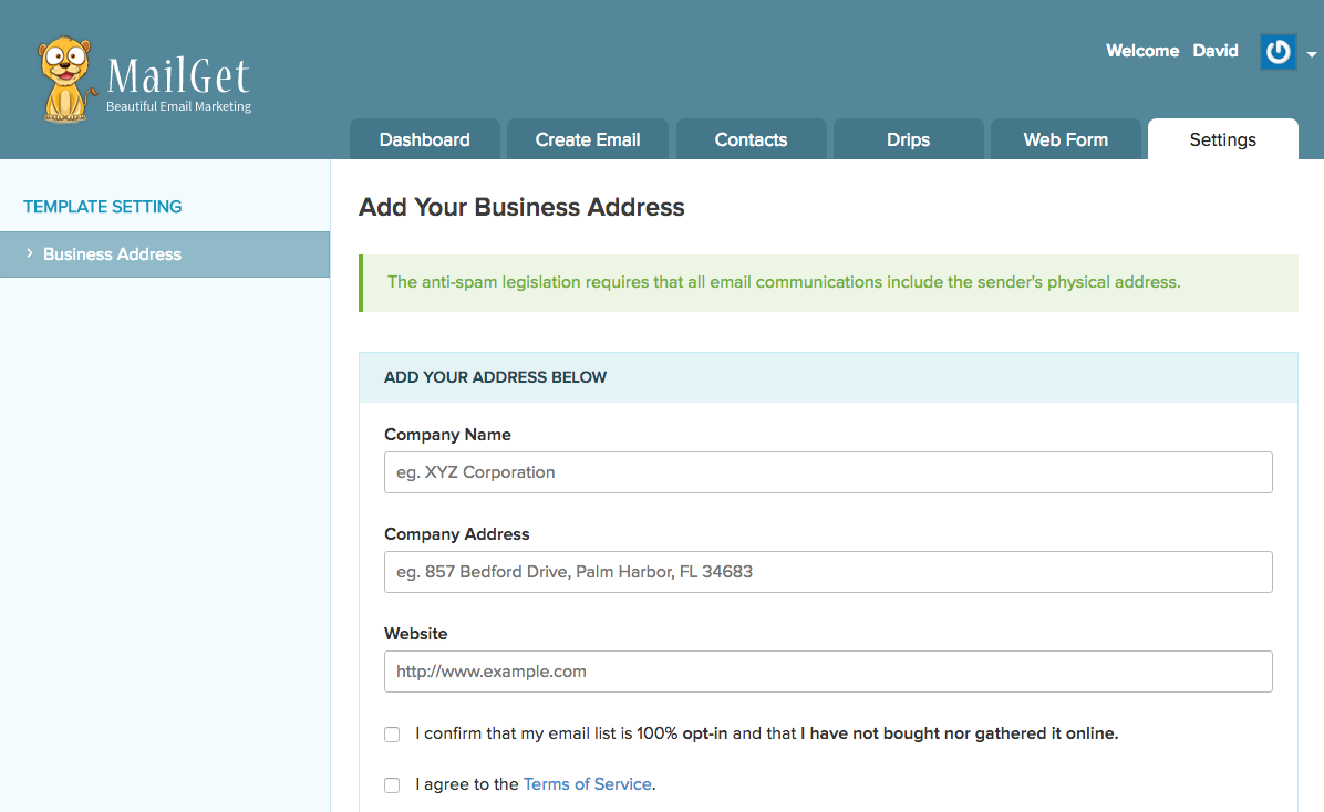 The next thing that really impresses me about MailGet is the step-by-step account setup process. The very first thing you're required to do when you start using your new account is to set up the legally-required footer information about your business. This is part of the United States' CAN-SPAM laws, providing email recipients with information about who is sending them emails as well as an easy way to unsubscribe.