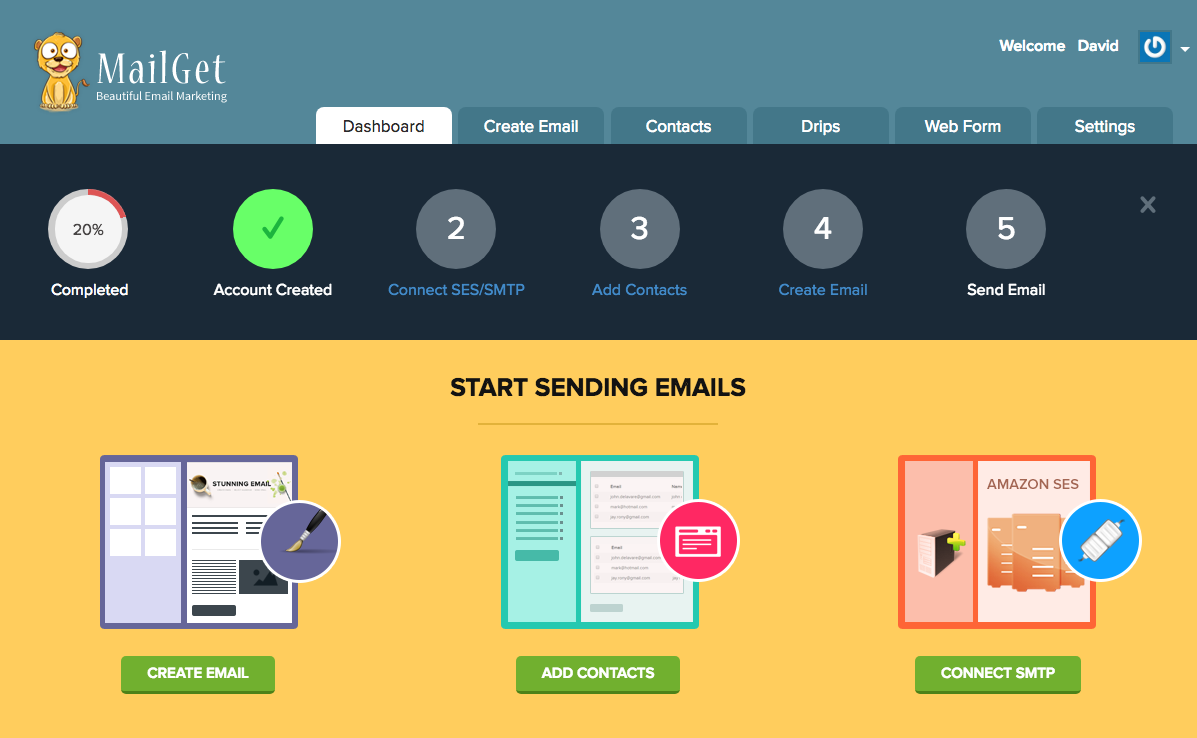 Once you complete the footer ‘contact' details and agree to comply with MailGet's terms of service, you'll be walked through the rest of the simple setup so you can start building your list and sending out emails. Here's a look at the clean, easy-to-follow, interface.