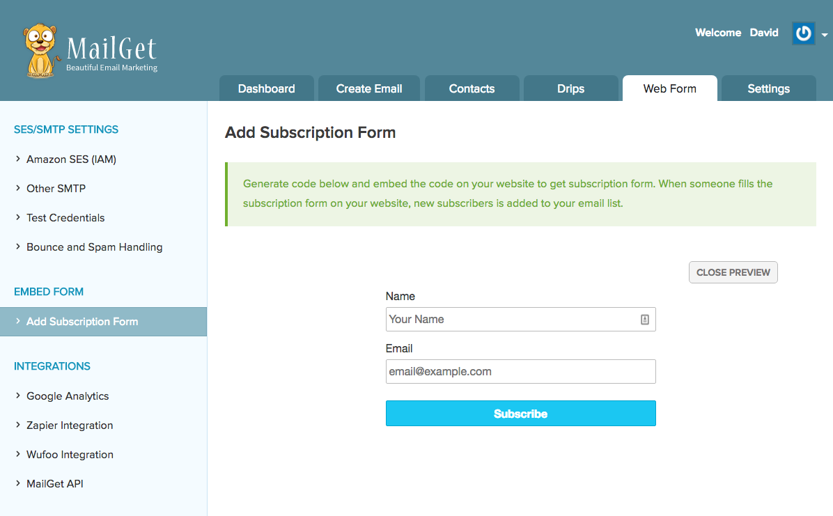 Of course, if you don't already have a list, or you'd like to continue building the one you have, MailGet gives you the ability to generate a custom form to add new subscribers to your list. You can either embed this form on your website or integrate it into third party tools like GROW where you can create custom landing pages and lead generation popups.