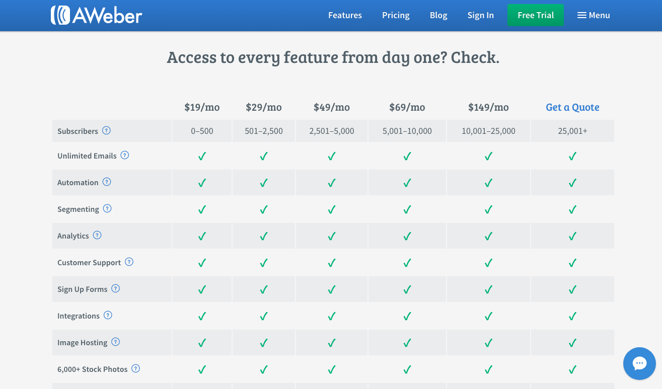 Aweber was the first email service I ever used. And while I didn't love them at the start, as I've worked on client projects using this tool over the past couple of years, they've vastly improved their interface and ease of use. But there's a cost to their growth (and to the growth of your list). While it might seem like a good deal at $19/mo, that will only get you to 500 subscribers. After that, things start to add up.