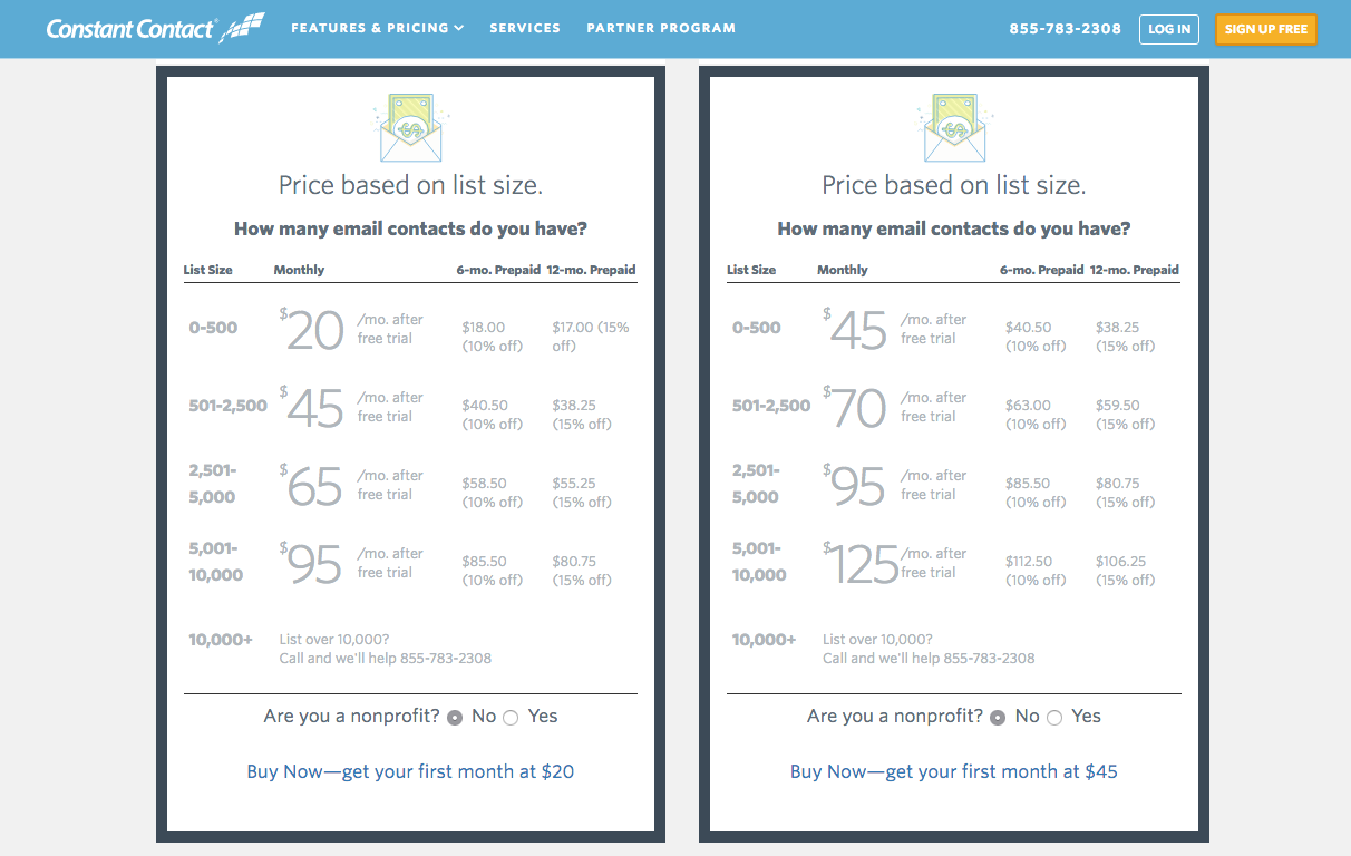 Constant Contact, which has a small army of “business marketing specialists,” has a corner on the market when it comes to small, local businesses and non-profits. But their features are, to my mind, less sophisticated and their platform is far from intuitive. And their prices, compared to others in their league, are far from competitive. To get the basic automation that Aweber and GetResponse offer, you have to pay a lot more (see the pricing options on the right).