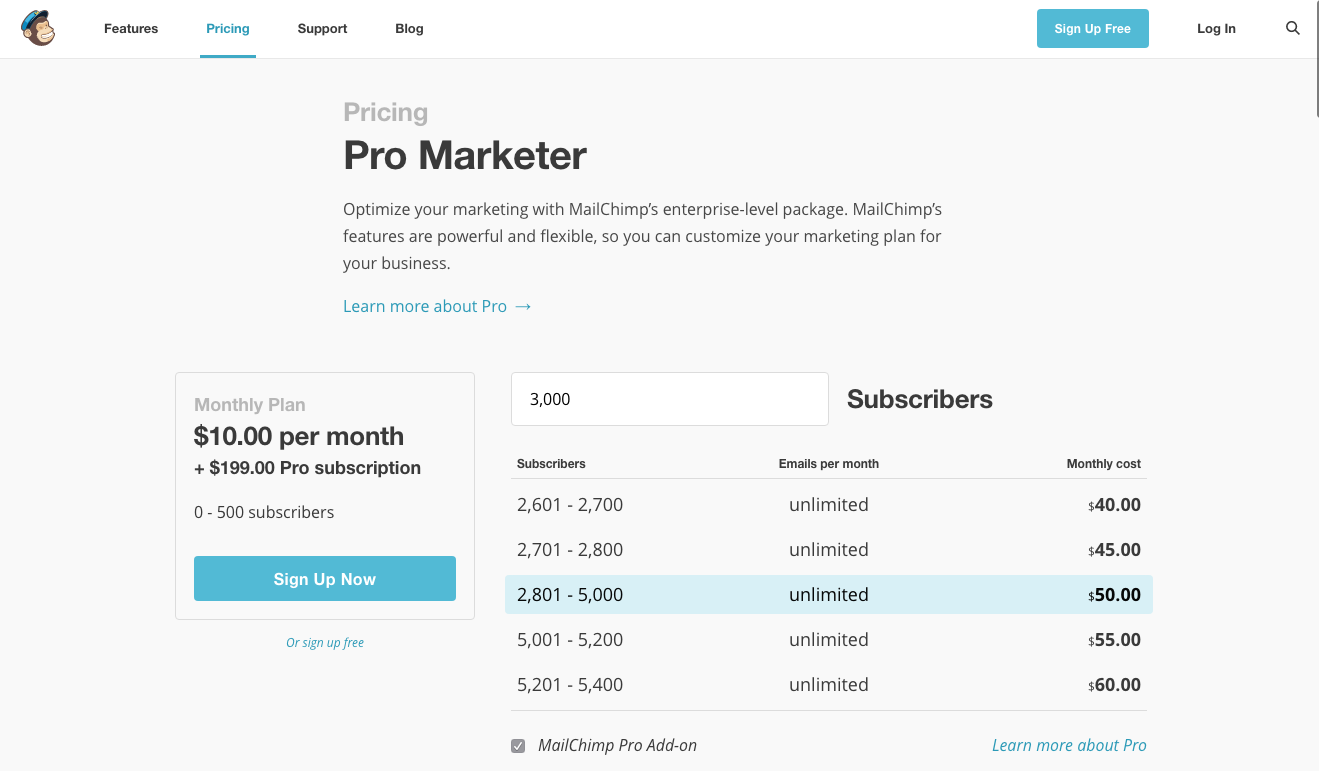 Finally, MailChimp, which has a limited-feature “free” plan for up to 2000 subscribers, comes in with slightly lower pricing that their competition (or so it seems). But as you stack on the a la cart features like reporting and advanced automation, you can find yourself spending a pretty penny.