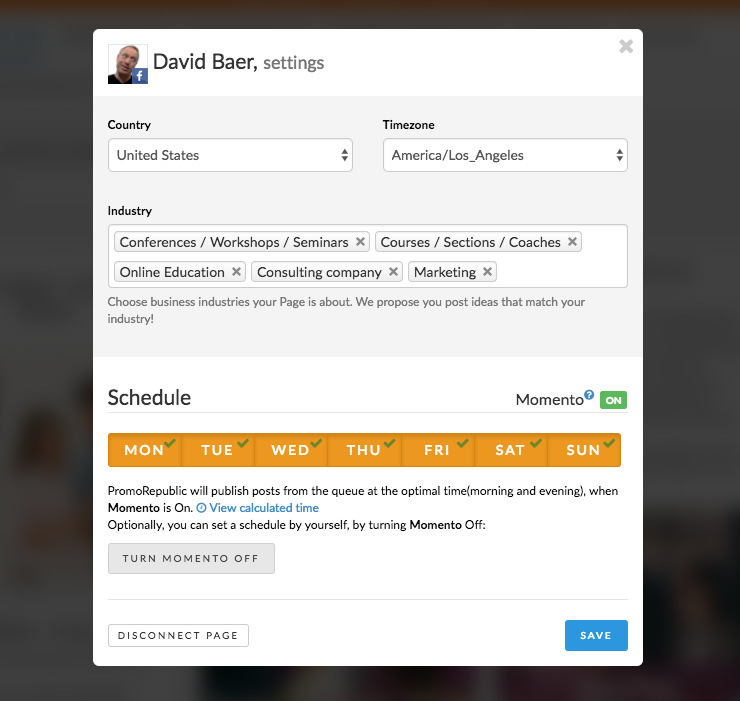 Once you've selected and authorized the connection to each social account, you'll set up a default posting schedule which tells PromoRepublic which days you want to post. They have an algorithm in place to identify the ideal posting times each day for you to get the best engagement, but you also have the option of scheduling specific times manually.