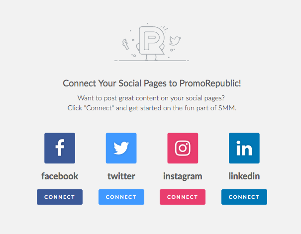 Here's how you get started inside PromoRepublic. Once you've registered on their platform, you simply connect your various social media accounts. As I mentioned earlier, they are currently integrated with Facebook, Twitter, Instagram, and LinkedIn.