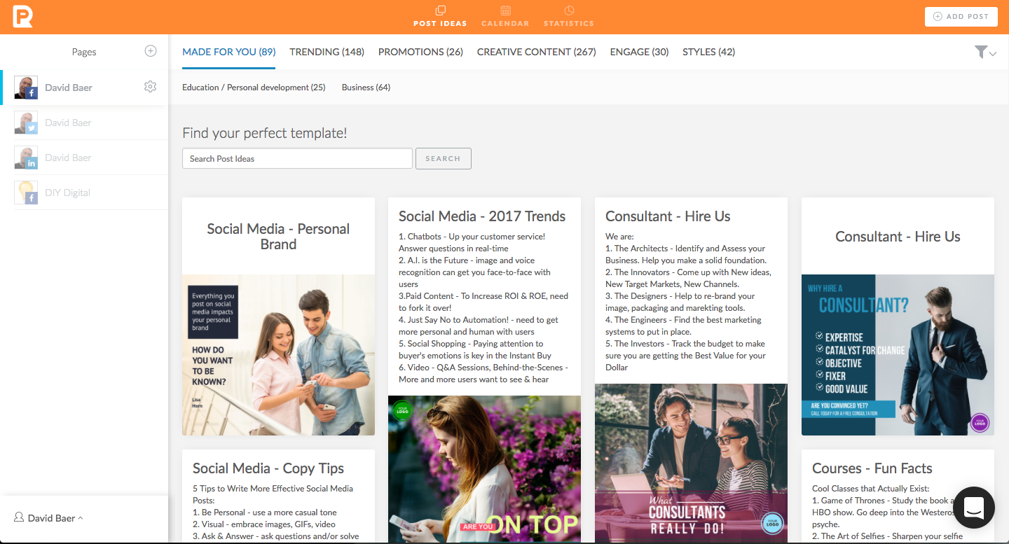 Once you have your accounts set up, your dashboard gets populated with post ideas. Some of these are spot on for the kind of content I want to share with my followers. Others might inspire some tweaks before posting. And because they are constantly developing new content in each category, I have yet to run into a situation where I can't find anything worth posting.