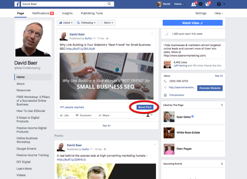 Facebook sometimes limits your audience if your engagement is low. The ability to “boost a post” so that your targeted audience sees the new post can quite beneficial and effective.