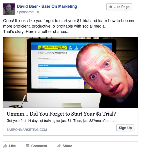 Since I am tracking who has signed-up for the $1 trial, and who has not, I can also run Facebook “retargeting” ads to people who have not yet taken advantage of it.