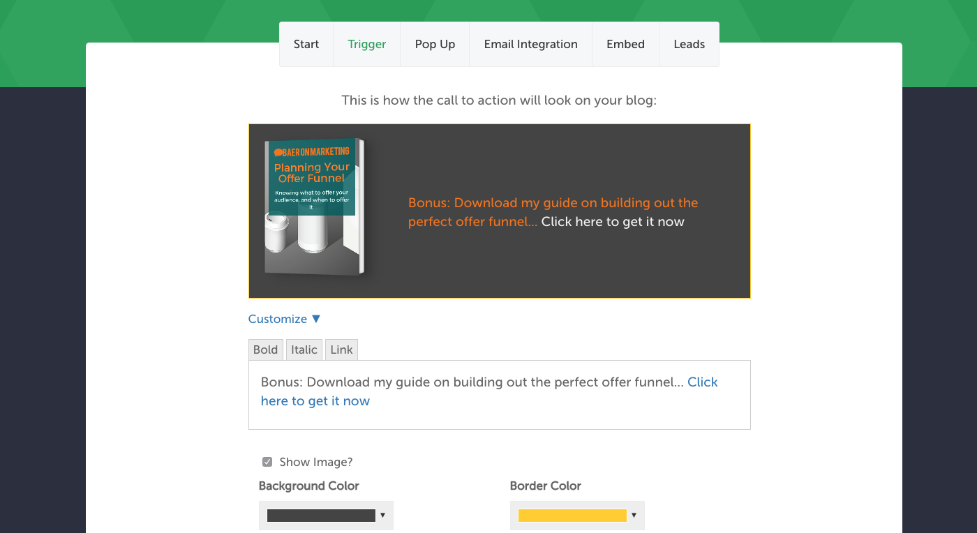 Another added feature I really like is the ability to design and build call-to-action triggers from inside their platform. You make a few design choices, copy their embed code, and paste it where you'd like the box to appear on your blog. Leads can be added to a CSV file or automatically passed along to HubSpot or MailChimp (hopefully other integrations will be added in the future).