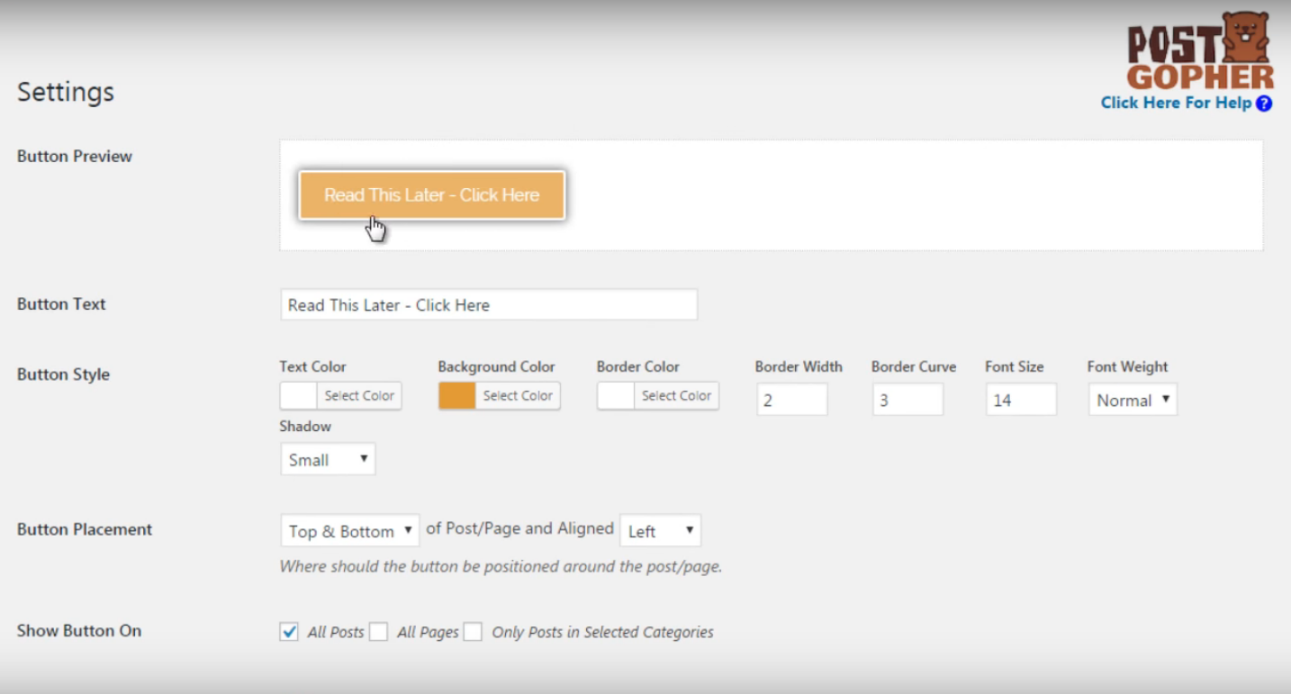 Here's what it looks like inside PostGopher's WordPress dashboard. As you can see, you can change the button text, colors, and define where the button is shown on the site.