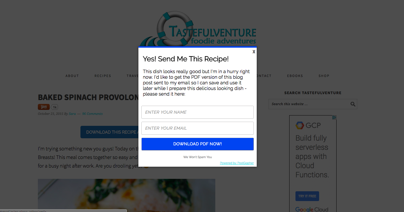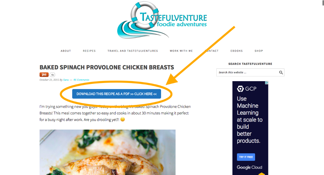 Here's how it works: You can assign PostGopher to include a button on any (or all) of your blog posts. In this example, readers are invited to get a copy of this baked chicken recipe sent to their inbox.