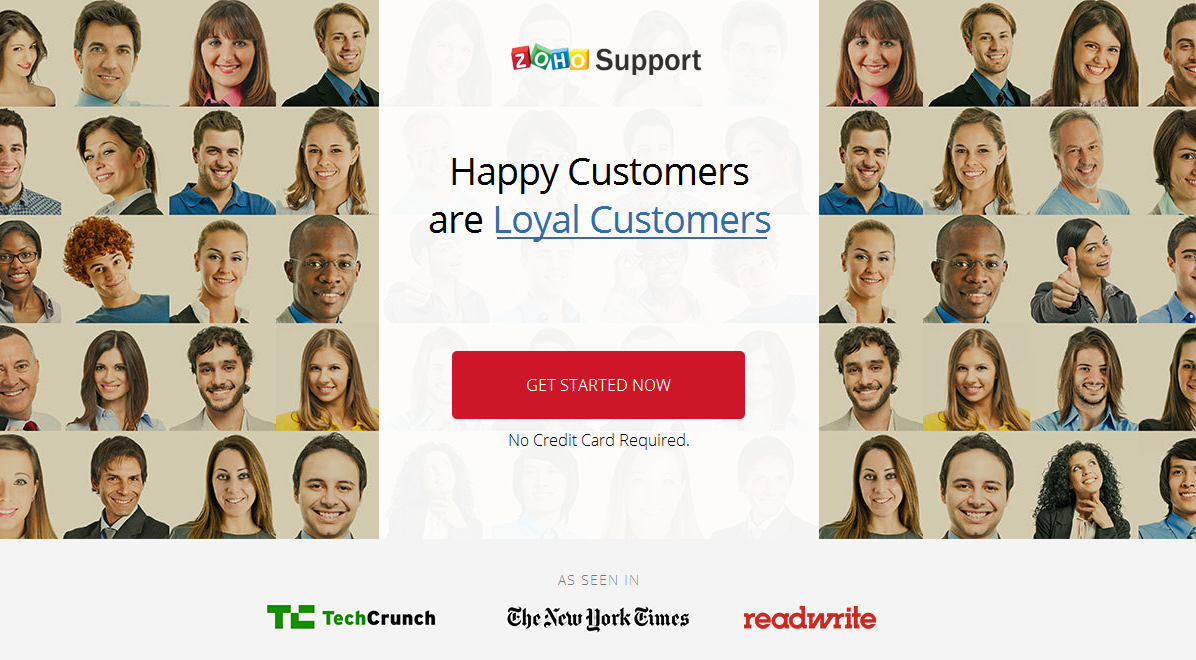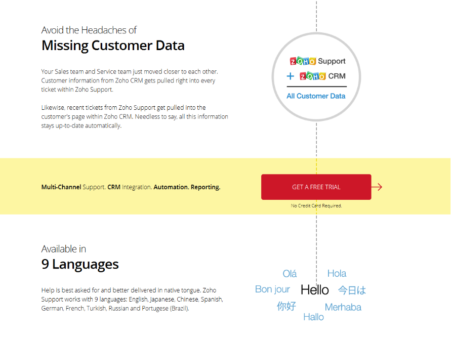 In the case of Zoho Support, they've placed a second call-to-action button further down the page from the one we looked at earlier. Notice how it's integrated into the visual design of the page to draw your eye directly to it. In addition, there's an arrow pointing from the button, as if to suggest that once you've clicked it, you then move forward.